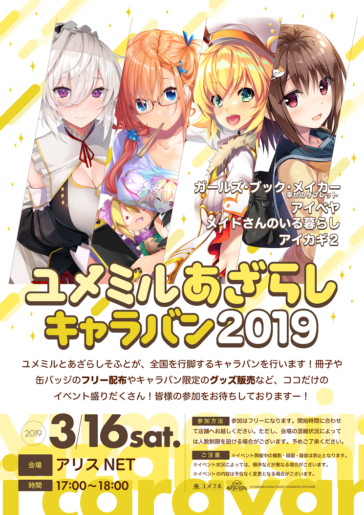 3月21日(木) 北海道・札幌 パソコンショップMK 様【時間】開店時~ 【補足】ゲストの参加はありません。3月22日(金) 京都・京都 メロンブックス京都店 様【時間】開店時~ 【補足】ゲストの参加はありません。3月22日(金) 宮城県・仙台 シーガル長町店 様【時間】開店時~ 【補足】ゲストの参加はありません。3月22日(金) 東京都・秋葉原 ソフマップ AKIBA①号店サブカル・モバイル館7F 様【時間】18:00~ 【ゲスト】まついさん・あおきゅん・夏彦・城崎冷水【補足】トークショーを含むイベントへの参加については、12時から整理券を配布します。3月23日(土) 愛知・名古屋 とらのあな名古屋 様【時間】13:00~ 【ゲスト】まついさん・あおきゅん・繭咲悠・まくら -